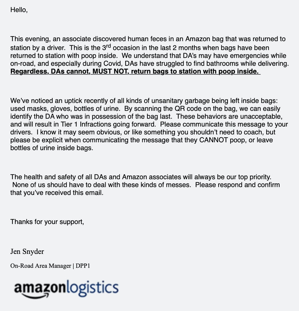 De situatie is zo schrijnend dat Amazon – ondanks het feit dat zij zeggen hier niets van af te weten – zelfs instructies heeft opgenomen in een brief naar de medewerkers omtrent urine in flesjes. Maar het gaat niet alleen om urine. Ook het poepen zou zelfs niet mogelijk zijn voor sommigen, en dan met name de bezorgers. Er zijn regelmatig tassen met menselijke poep gevonden die iemand anders dan weer lekker fris in zijn handen kreeg bij het controleren. Ook hier heeft Amazon kennis van genomen, aangezien er intern een mail is rondgegaan waarin dit genoemd wordt.