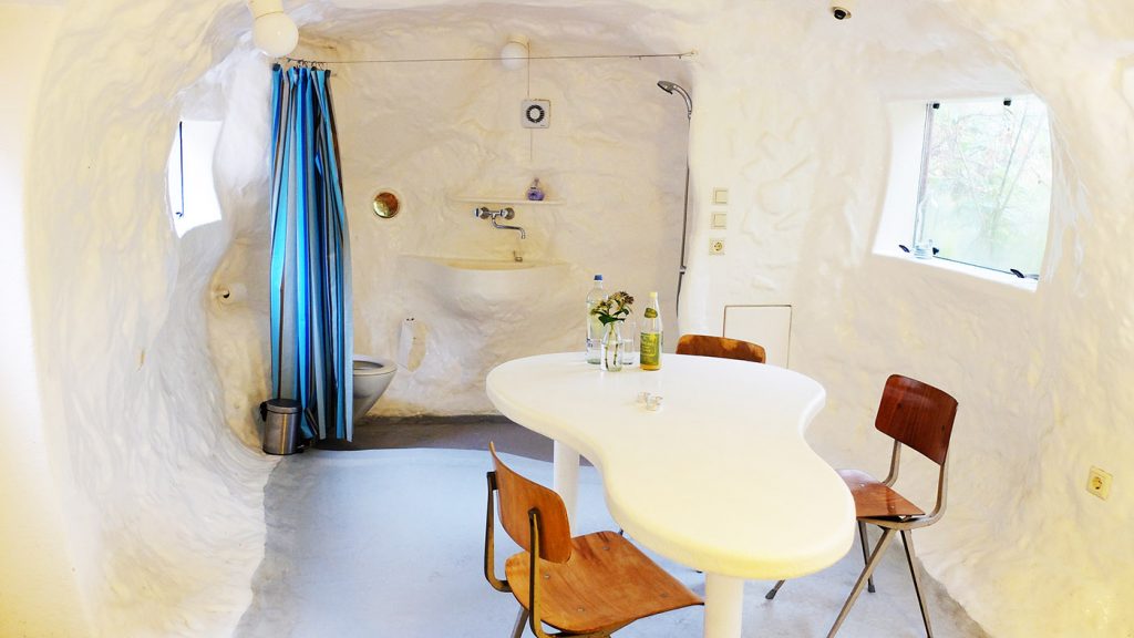Ironisch genoeg is er een toilet aanwezig, evenals een douche, elektriciteit en verwarming. De buitenkant van de anus staat in schril contrast met de muren van de binnenkant die hagelwit zijn.