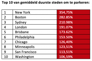 Wil je je auto in Manhattan parkeren? Dan ben je 354,75 procent duurder uit dan de gemiddelde wereldwijde parkeerprijs. Boston is goede tweede met een plus van 282,85 procent en op de derde plek staat Sydney met een 210,98 procent hoger uurtarief dan gemiddeld. Zoals gezegd is Amsterdam de ‘beste’ Nederlandse stad met een zestiende plaats. Lekker goedkoop is het in Delhi, India. Daar betaal je 210,98 procent minder dan gemiddeld. Buenos Aires en Kaapstad staat tweede en derde met uurtarieven die respectievelijk 79,96 en 77,60 procent lager liggen.