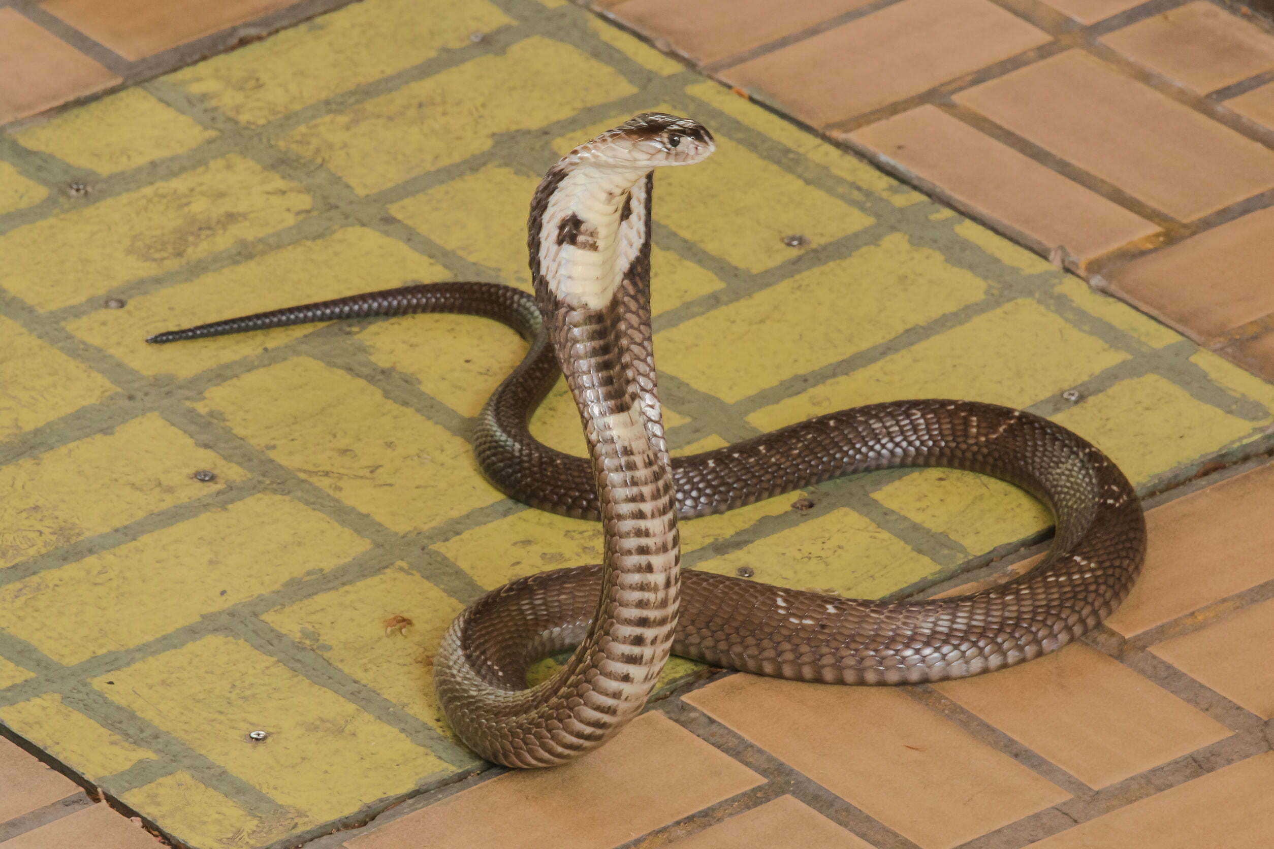 De Koningscobra is een slang die wel 5,5 meter kan worden. De beet van dit dier kan zonder moeite een mens doden. De slang is schuw, maar zal zonder twijfelen een straal gif in je gezicht spugen en je enkels volpompen met het dodelijke goedje als je hem in het nauw drijft. Een wandeltocht in Zuidoost-Azië is dus niet zonder gevaar.