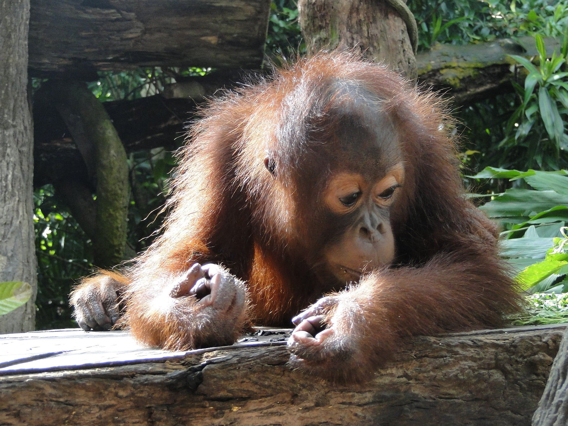 De orang-oetan is de grootste aap die in de boomtakken leeft en komt uitsluitend op Borneo en Sumatra voor. De plaatselijke bewoners noemen de aap ook wel spottend Dutch monkeys, vanwege hun roodachtige vacht en dikke buik. Maar een orang-oetan is beslist geen doetje. Een volwassene kan zich aan één vinger ophijsen en beschikt over enorme spierkracht. Toch is ook deze mensaap bedreigd in het voortbestaan. Er zijn er volgens schattingen inmiddels niet meer dan tussen de 45.000 en 60.000 en dat aantal neemt nog steeds af .