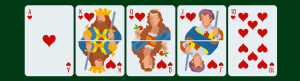 Bij een Flush heb je vijf kaarten van hetzelfde soort. Hierbij maakt de waarde van de kaarten niet uit.