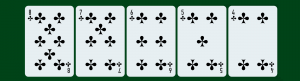 De op één na beste pokerhand is de Straight Flush. Hierbij kan je een onafgebroken reeks maken van vijf kaarten. Denk bijvoorbeeld aan 4 – 5 – 6 – 7 – 8 of 8 – 9 -10 – Boer – Vrouw. Hierbij zijn alle kaarten van hetzelfde soort. Je kan geen Straight Flush maken met een Aas, want dan is er sprake van een Royal Flush én dat is weer net wat beter.