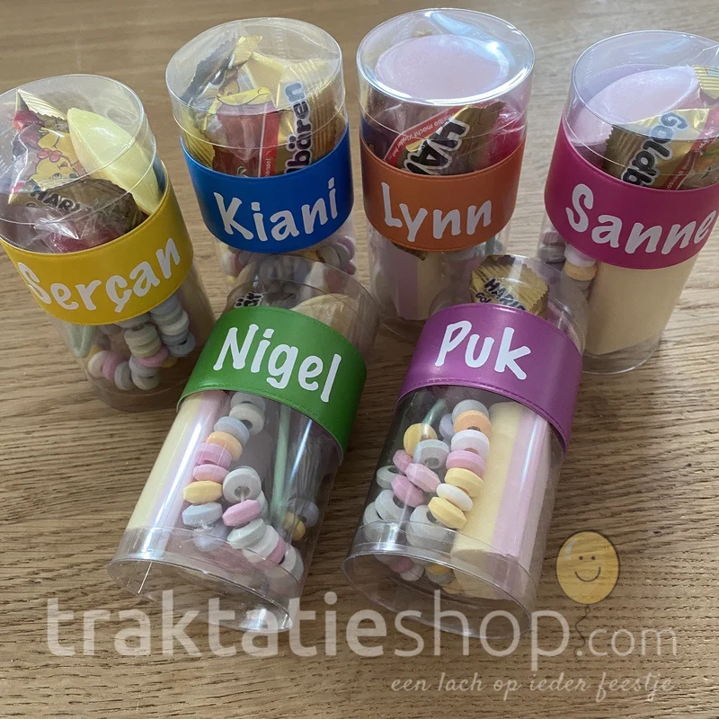 De snoep met klaparmband is al jarenlang een populaire verjaardag traktatie. Logisch ook, aangezien zo’n armband altijd leuk is. Bovendien is het super leuk dat je op de armband de naam van de ontvanger kunt bedrukken. De namen voor de armbanden kun je bij het bestellen aangeven, waarna deze netjes verwerkt worden. Dit is hierdoor één van de meest persoonlijke verjaardag traktaties van dit moment.