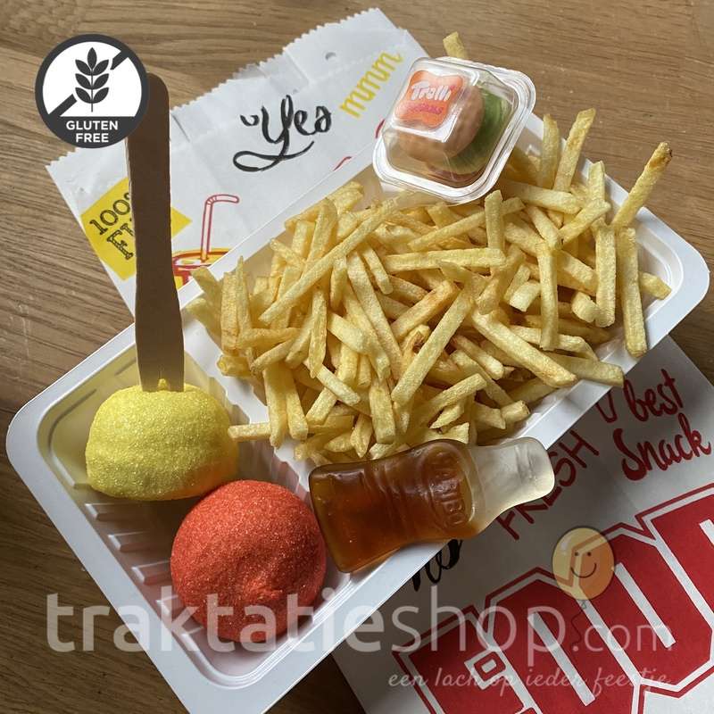 Het is onwijs leuk om een complete snack bag te trakteren. Het gaat hierbij om een snack bag in de vorm van een frietbakje, waarin je meerdere lekkernijen neer kunt leggen. Hierbij kun je denken aan een cola fles snoepje, 2 spekbollen en een hamburger. In deze traktatie vind je alleen de frietjes niet; deze frietjes, in de vorm van chips, kun je zelf eventjes kopen en in het frietbakje leggen. Deze complete snack kun je vervolgens op een makkelijke manier uitdelen.