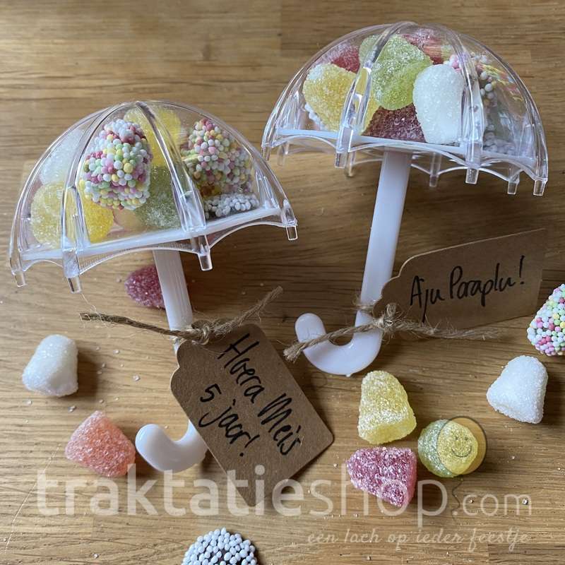 De Aju Paraplu is één van de meest originele verjaardag traktaties. Dit betreft namelijk een paraplu die aan de bovenzijde gevuld kan worden met tumtums. De paraplu en een zak tumtums krijg je geleverd, waarna je zelf de paraplus kunt vullen. En zoals je op de foto kunt zien, kun je ook nog een leuk label aan de paraplu vastmaken. Dit label kun je overigens bij het bestellen van deze paraplus direct mee bestellen. Wil je de paraplu graag ook nog met andere lekkernijen vullen? Dat is mogelijk, zolang het allemaal in de paraplu past.