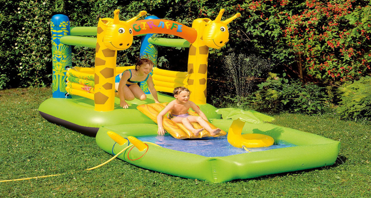 Je hebt geen kind meer aan de kinderen als je dit springkussen in de tuin hebt staan. Voor de ultieme waterpret met de warme dagen is dit speelkussen ideaal. Het heeft alles waar een kind uren zoet mee kan zijn, zoals een glijbaan, een zwembadje, en een palmboom met sproeifunctie. Kinderen vanaf 3 jaar kunnen zich er de hele dag mee vermaken.