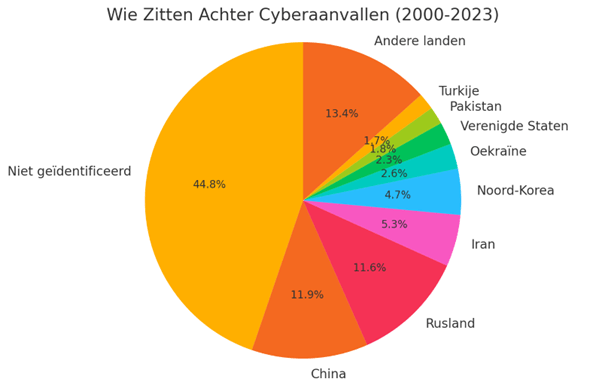 Een ander inzicht geeft wellicht het probleem duidelijker weer; Landen verantwoordelijk voor het grootste aandeel cyberincidenten met een politieke dimensie van 2000 tot 2023 (dus niet specifiek gerelateerd tot de casinobranche):