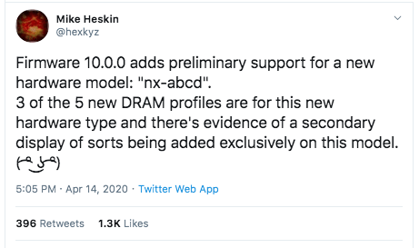 Volgens Heskin wordt er in de de code van de software verwezen naar een nieuw model onder het typenummer ‘nx-abcd’. De technische specificaties tonen aan dat dit model voldoende werkgeheugen heeft om een tweede scherm te ondersteunen.