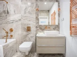Een badkamer met een koperlook kan je verder afwerken met badkameraccessoires die van koper zijn gemaakt. Denk bijvoorbeeld aan een spiegel met een koperen rand, een koperen wc borstelset of een wc rollenhanger van koper.