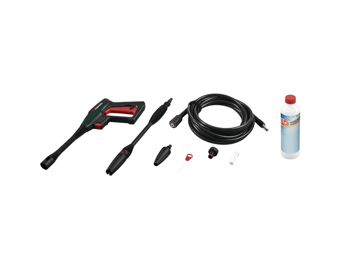 Verder is de hogedrukreiniger voorzien van een ergonomische pistoolgreep, waardoor het apparaat lang kan worden gebruikt zonder dat er pijn in de handen ontstaat, deze greep is ook voorzien van kinderbeveiliging. De reiniger heeft een snelkoppelsysteem, waardoor de opzetstukken eenvoudig kunnen worden gewisseld. Dankzij de 7 meter lange anti-twist hogedrukslang is elk hoekje van de tuin of het terras te bereiken.