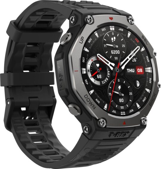 De Amazfit T-Rex 3 in zwart is dé gadget voor iedereen die houdt van actie en avontuur. Met zijn robuuste design en militaire certificering overleeft dit horloge de heftigste omstandigheden, of je nu gaat klimmen, hardlopen of gewoon een drukke dag hebt.