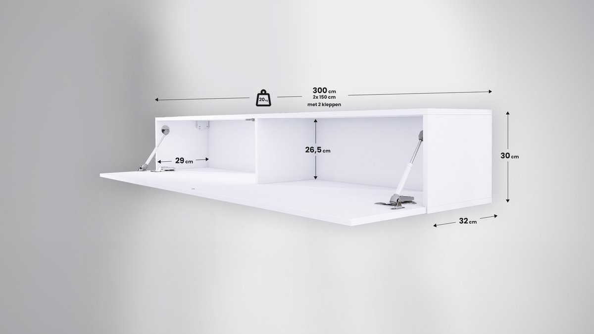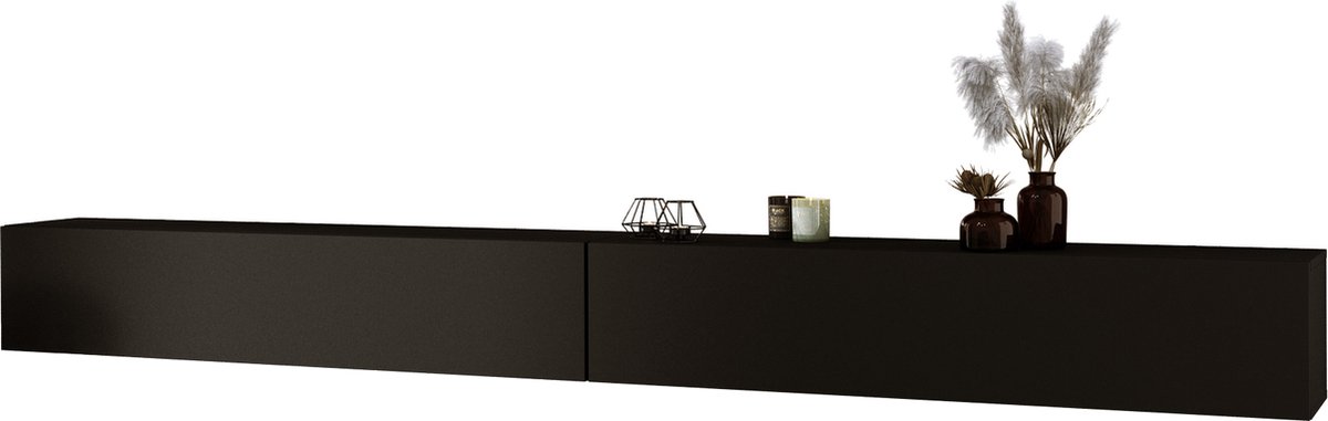 Ben je op zoek naar een eyecatcher voor je woonkamer? Dit hangende Diamond TV-meubel in mat zwart is precies wat je nodig hebt. Met een indrukwekkende breedte van 300 cm (2×150 cm) biedt deze kast niet alleen plek voor je televisie, maar ook voor al je accessoires, kabels en decoratie. Het strakke, moderne design geeft je ruimte een minimalistische en luxe uitstraling.