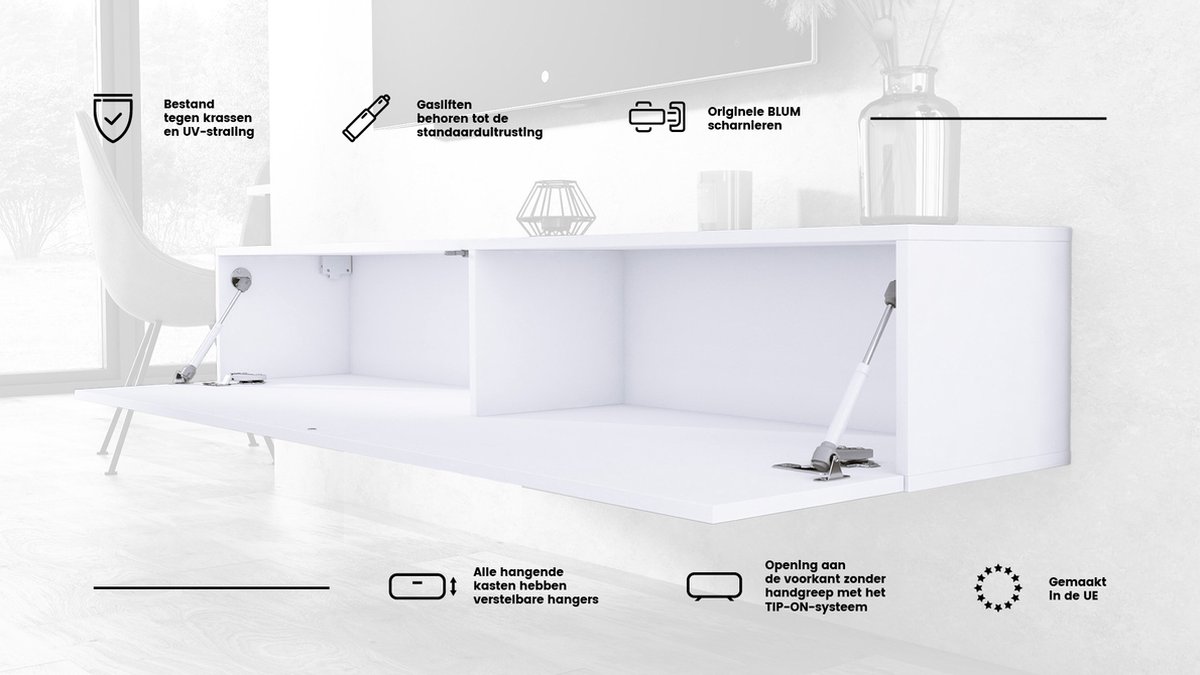 Wat dit meubel zo fijn maakt? Het hangt aan de muur, waardoor je vloer vrij blijft en je woonkamer groter oogt. Gebruikers waarderen het stevige materiaal en de eenvoudige montage. Het matzwarte oppervlak is trouwens superhandig: vingerafdrukken zie je amper!