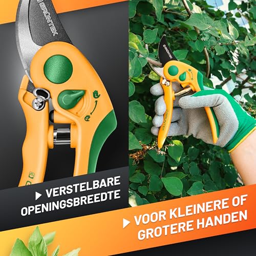 Ben je op zoek naar een snoeischaar die je tuinwerk een stuk makkelijker maakt? Dan is de GRÜNTEK FLAMINGO Bypass Snoeischaar dé keuze voor jou. Deze schaar ligt lekker in de hand dankzij het ergonomische design en snijdt moeiteloos door takken, heggen en bloemen. Het Teflon-gecoate mes van SK5 staal blijft scherp en voorkomt dat sap of vuil blijft plakken. Gebruikers zijn vooral blij met de verstelbare openingsbreedte (tot 21 mm), waardoor je zowel kleine als dikkere takken aankunt. Een klein minpuntje? Sommigen vinden de schaar wat zwaar na lang gebruik, maar dat weegt niet op tegen de precisie.