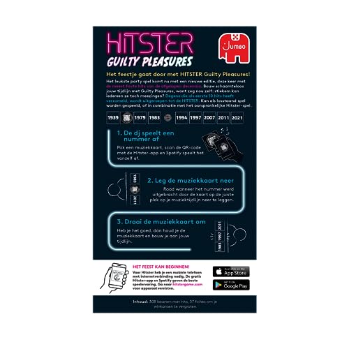 Ben je klaar voor een avond vol lachen en foute hits? Hitster Guilty Pleasures is hét muziekspel dat je feestje naar een hoger niveau tilt! Dit kaartspel voor volwassenen (vanaf 16 jaar) draait helemaal om die guilty pleasure nummers die iedereen stiekem kent. Of je nu met 2 of 10 spelers bent, het blijft hilarisch om te raden welke hit bij welk jaar hoort. Superleuk voor een gezellige avond met vrienden of familie!