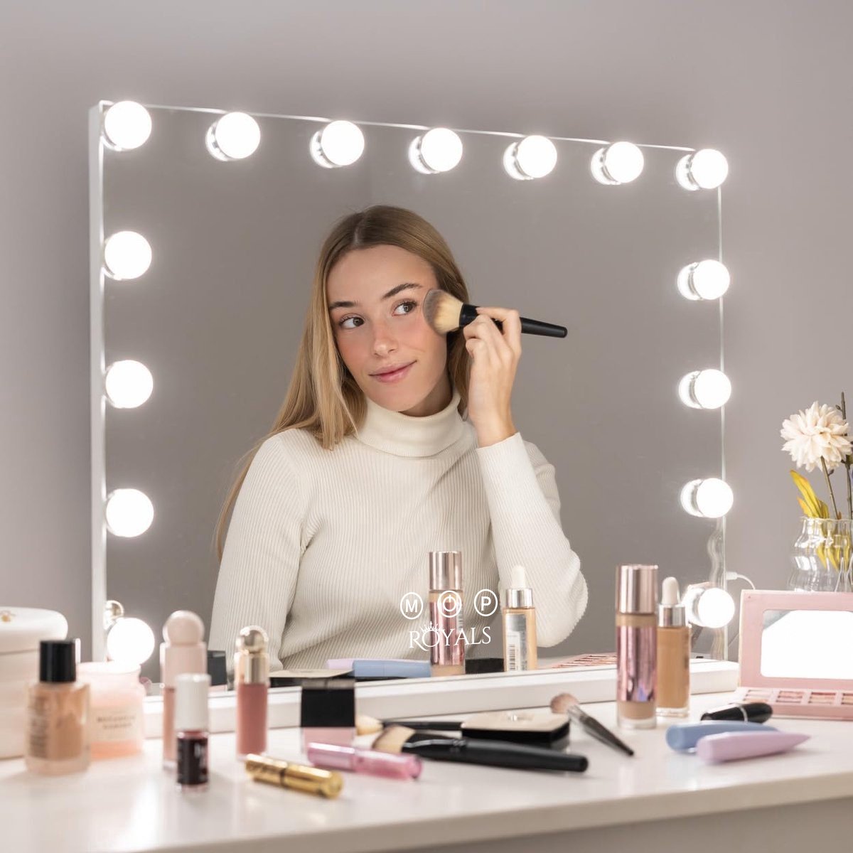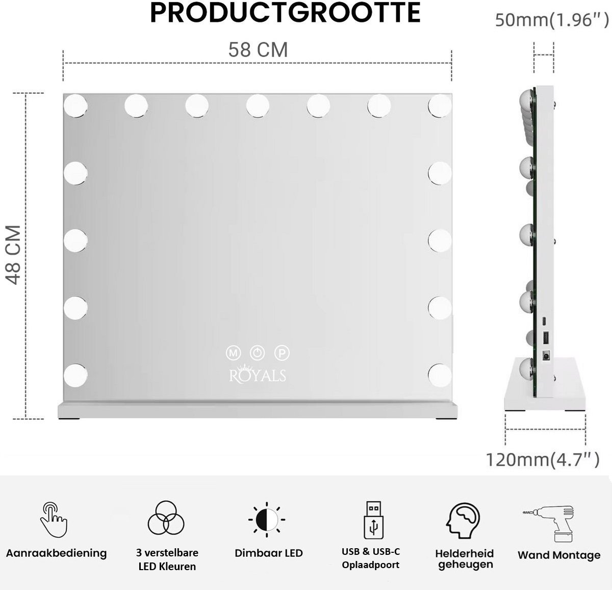 Ontdek de Royals Hollywood Spiegel met 15 LED-lampen, 3 lichtstanden en dimfunctie. Perfect voor make-up en visagie. Bestel nu bij Trending.nl!