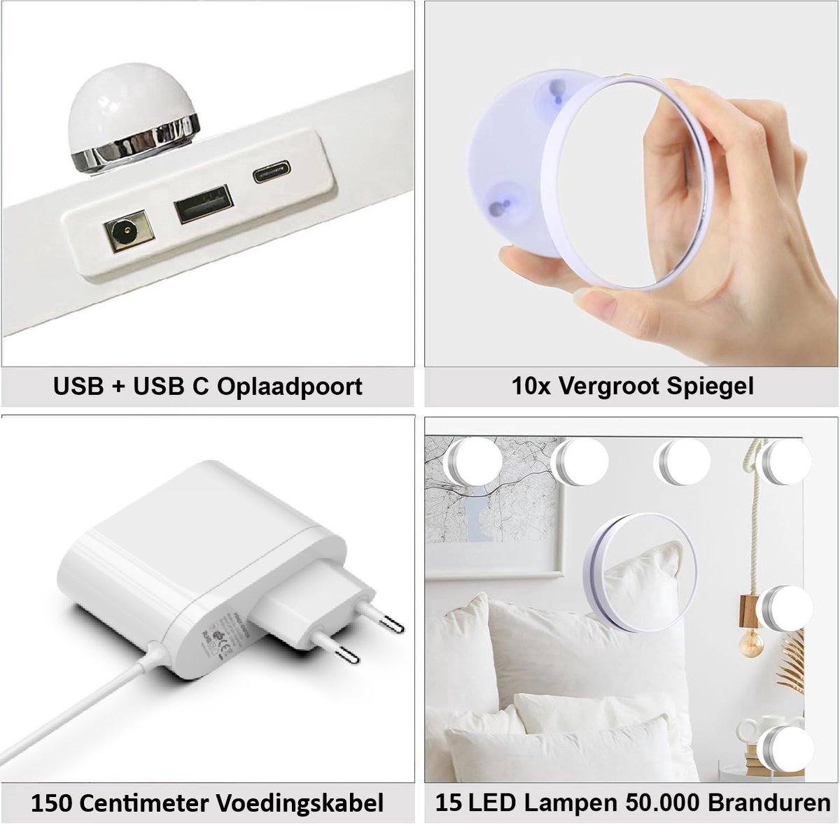 Deze visagie spiegel heeft ook een 10x vergrotingsoptie, ideaal voor die precieze details zoals eyeliner of wenkbrauwen. Dankzij de smart touch-bediening switch je moeiteloos tussen de standen. En met zowel een USB- als USB-C-oplaadpoort is-ie helemaal klaar voor de toekomst. Gebruikers zijn fan van het strakke design en hoe makkelijk deze Hollywood Spiegel in gebruik is.