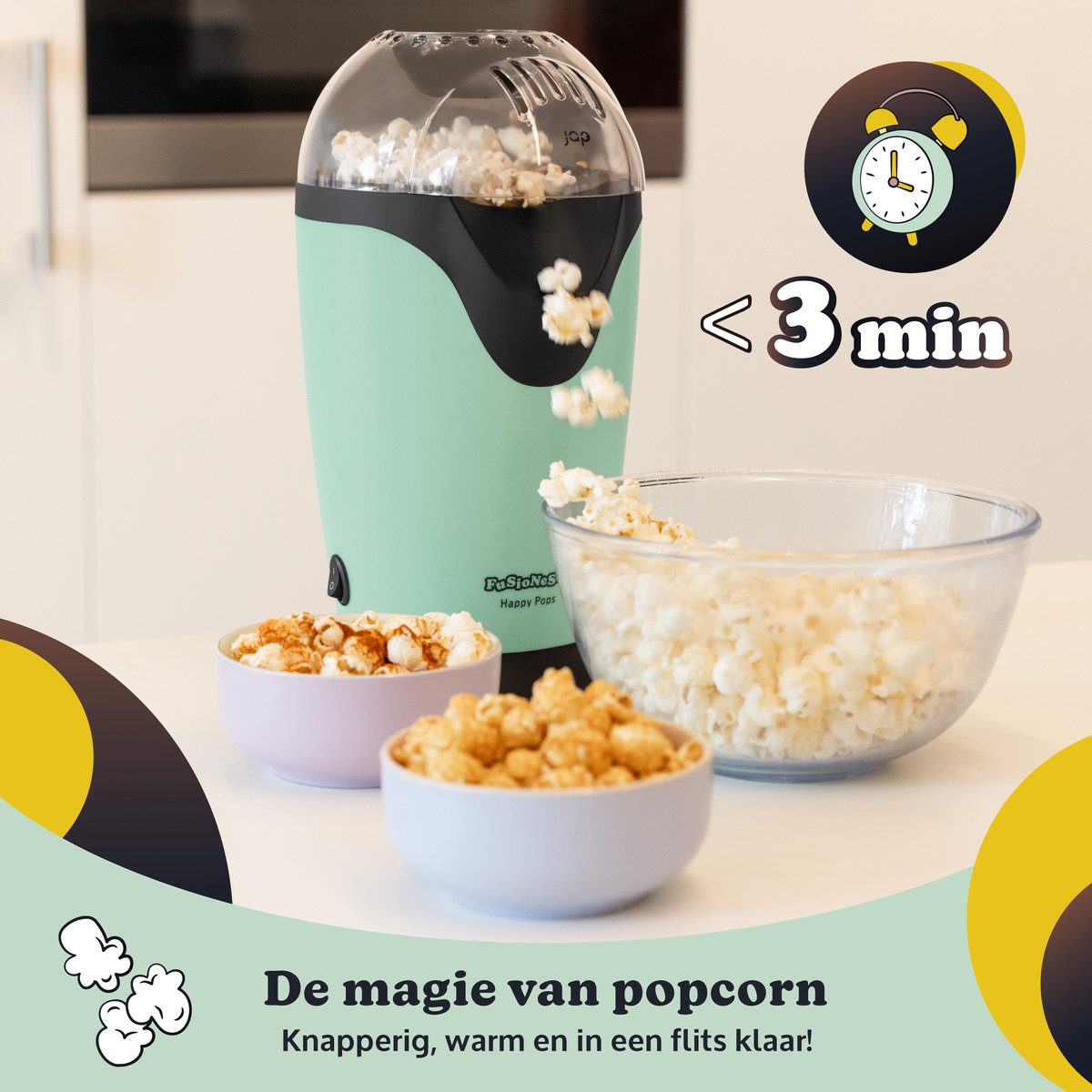 Een filmavond zonder popcorn? Onmogelijk! Met de JAP Appliances Happy Pops retro popcorn machine tover je in slechts 3 minuten een lekkere portie popcorn op tafel. Deze groene eye-catcher brengt niet alleen sfeer in je keuken, maar maakt ook nog eens gezonde snacks zonder olie. Perfect voor 2-3 personen, dus ideaal voor een gezellige avond met vrienden of familie.