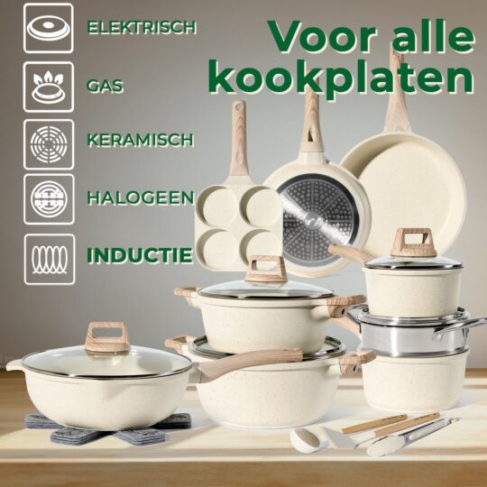 De set bestaat uit 21 delen, inclusief deksels, zodat je voor elke maaltijd de perfecte pan of koekenpan hebt. De koudgrepen zorgen ervoor dat je je vingers niet brandt, zelfs als de stoofpot al uren pruttelt. Gebruikers zijn blij met de stevige kwaliteit en het makkelijke onderhoud – even afwassen en je bent klaar.