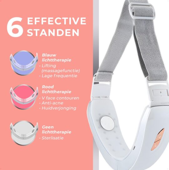 Het apparaat combineert gezichtsmassage met een slankmakende band om je dubbele kin aan te pakken. Gebruik het regelmatig en zie hoe je kaaklijn steeds strakker wordt. Compact, gebruiksvriendelijk en ideaal voor je dagelijkse huidverzorgingsroutine.