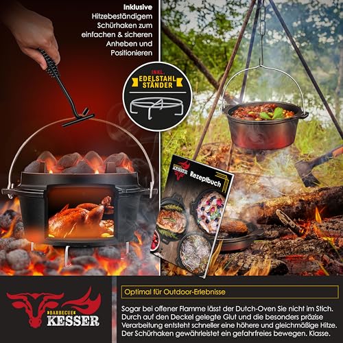 Ben je klaar om je kookkunsten naar een hoger niveau te tillen? De KESSER Dutch Oven set is dé must-have voor iedereen die houdt van stoofgerechten, BBQ of gewoon lekker experimenteren in de keuken. Deze gietijzeren vuurpan van 7,3 liter is perfect voor zowel binnen als buiten. Of je nu een sappige stoofpot maakt of brood bakt boven een kampvuur, met deze pan lukt het allemaal.