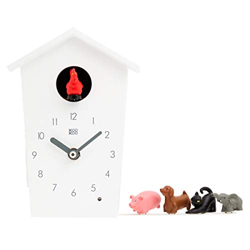 Ben je klaar voor een beetje boerderijgevoel in huis? De KOOKOO AnimalHouse koekoeksklok in wit brengt de natuur naar je woonkamer met vijf verschillende boerderijdierengeluiden. Geen standaard ‘koekoek', maar een blatende schaap, loeiende koe of kakelende kip. Superleuk voor kinderen én volwassenen die houden van een speels accent in hun interieur.