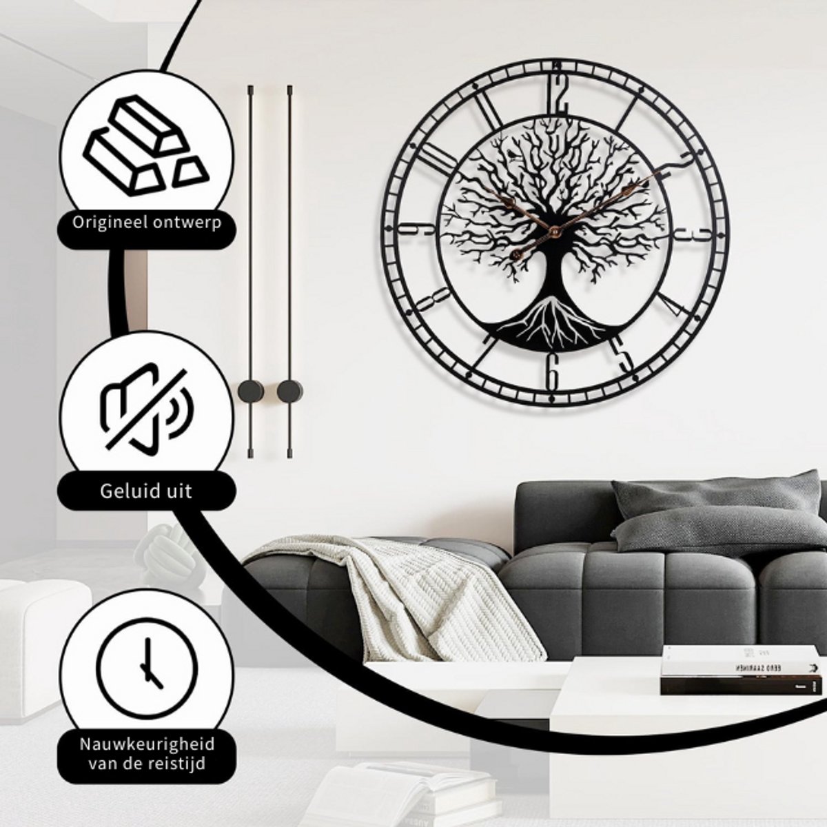 Ontdek de stijlvolle Levensboom Klok in zwart metaal. Een moderne blikvanger voor je woonkamer, geruisloos en chic. Bestel nu bij Trending.nl!