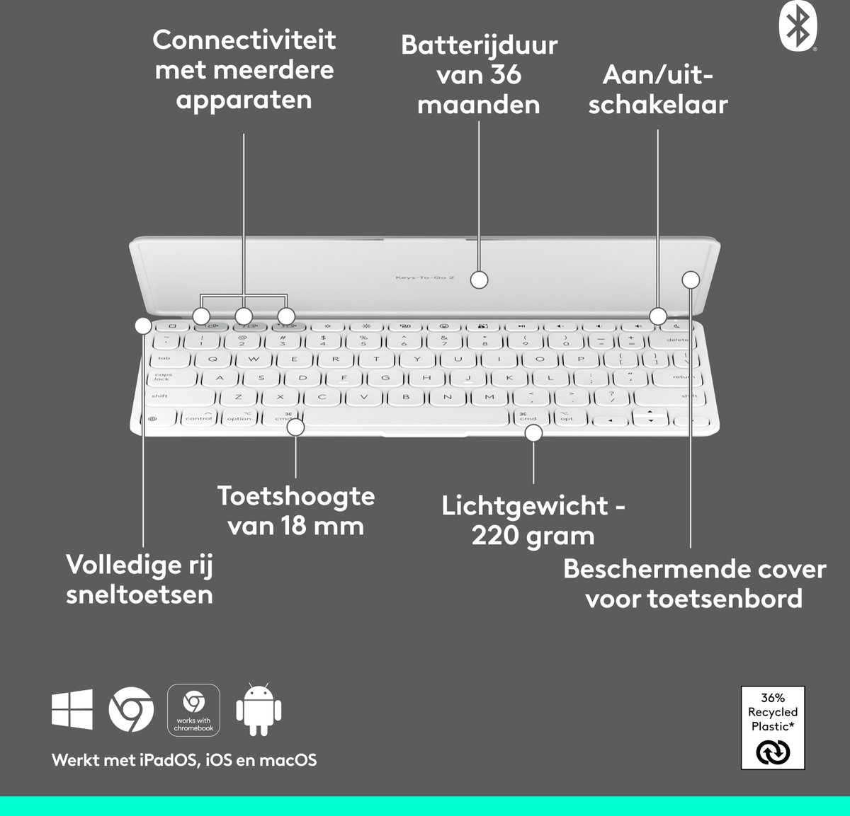 Ben je vaak onderweg en wil je toch lekker typen op je tablet of iPhone? Dan is de Logitech Keys To Go 2 jouw nieuwe beste vriend. Dit draadloze tablettoetsenbord is superlicht, past in elke tas en werkt naadloos met iPad, iPhone en Mac. Het strakke design in Pale Grey ziet er ook nog eens tof uit, of je nu in een café zit of op de bank hangt.