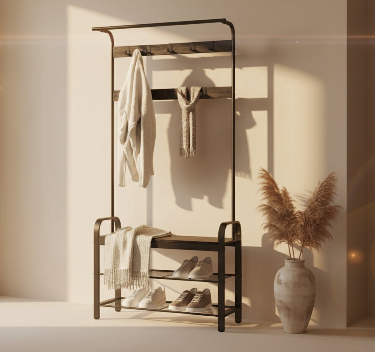 Gemaakt van stevig metaal en spaanplaat, staat dit MAZAZU garderoberek garant voor duurzaamheid. Hang je jassen op, leg je tassen neer en berg je schoenen netjes onderin op. Gebruikers zijn enthousiast over het gemak en de ruimte die het bespaart. Superhandig voor wie houdt van een opgeruimd huis zonder gedoe.