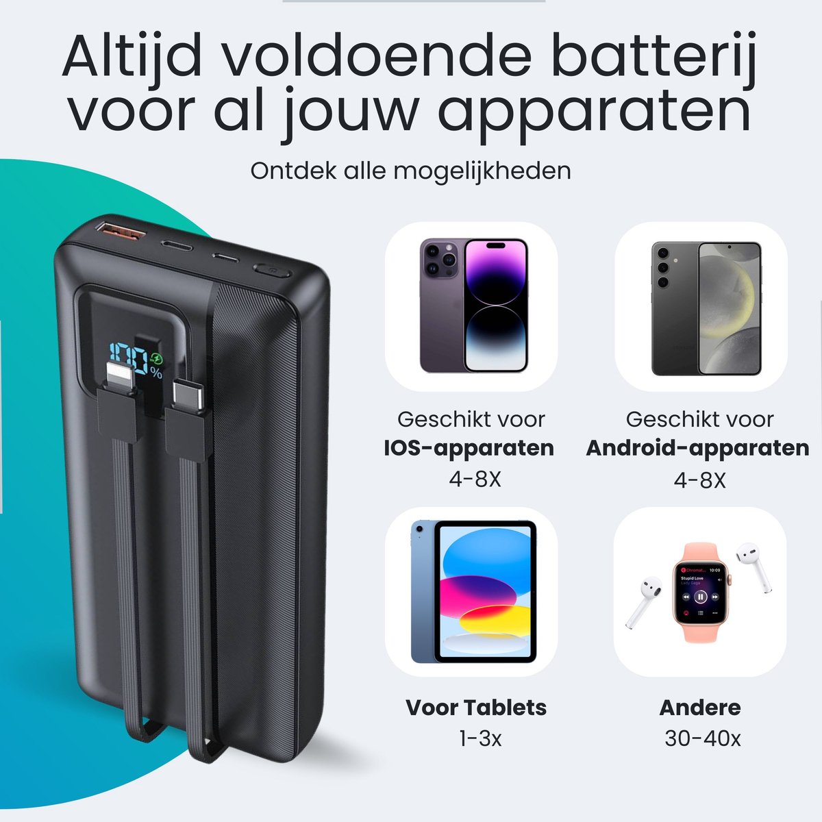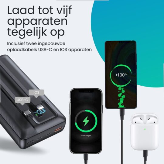 Echt een topding deze powerbank. Er zitten twee kabels ingebouwd (één voor Android en één voor iPhone), dus je hoeft nooit meer een kabel te vergeten. Ik gebruik de USB-C voor mijn telefoon en dat gaat supersnel. Ook fijn dat er een helder schermpje op zit dat precies aangeeft hoeveel procent er nog over is. Ziet er ook nog eens mooi uit!