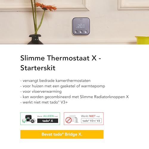 Met de tado Slimme Thermostaat X Starter Kit haal je een superhandig systeem in huis om je verwarming slimmer te regelen. Via de app of je smart speaker (Alexa, Siri, Google Assistant) stel je alles makkelijk in, waar je ook bent. Deze bekabelde kamerthermostaat komt met een Bridge X voor een stabiele verbinding. Zelf installeren is goed te doen, al moet je even opletten dat hij niet compatibel is met de tado° V3+.