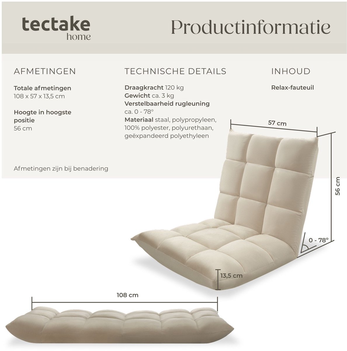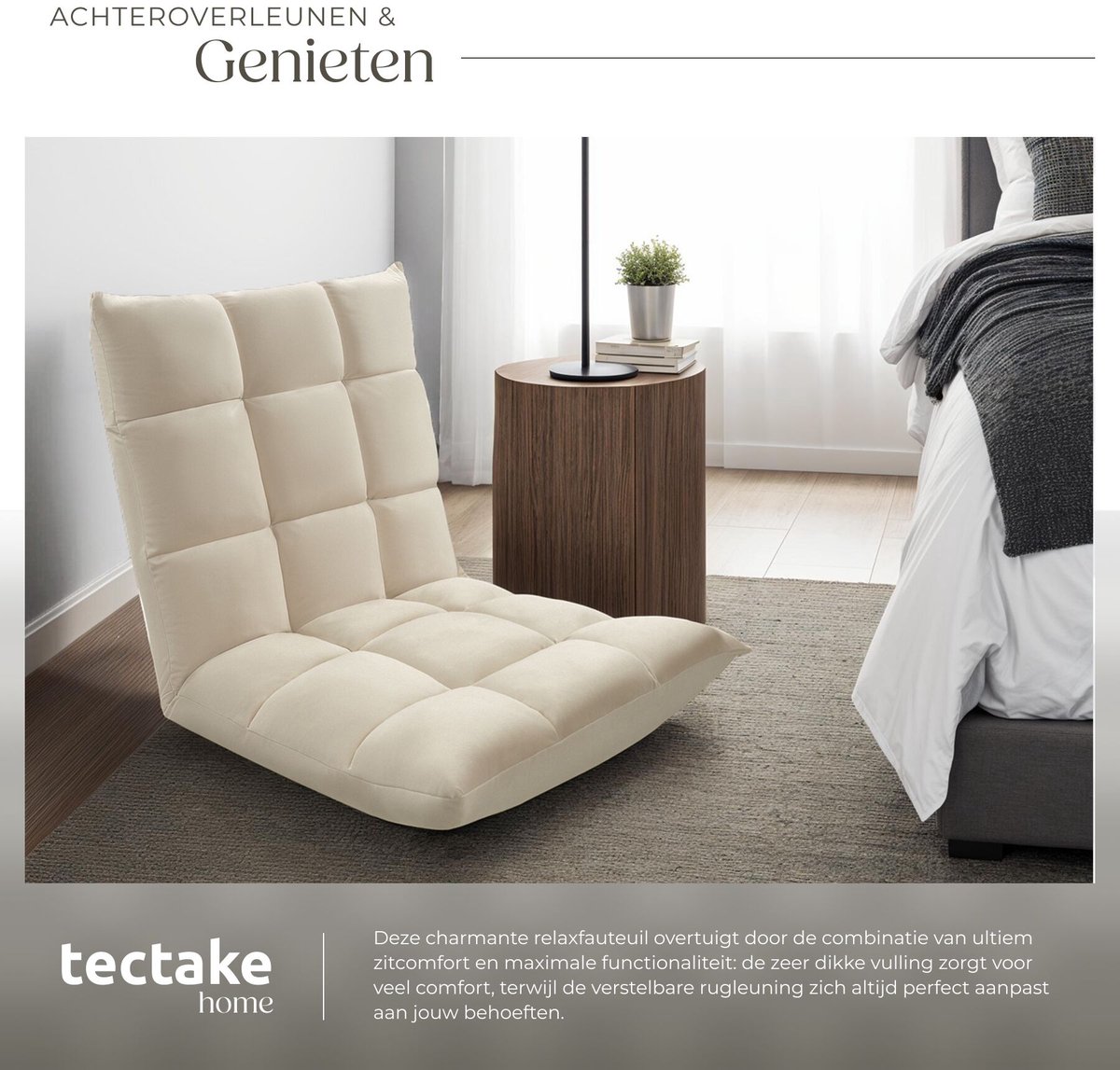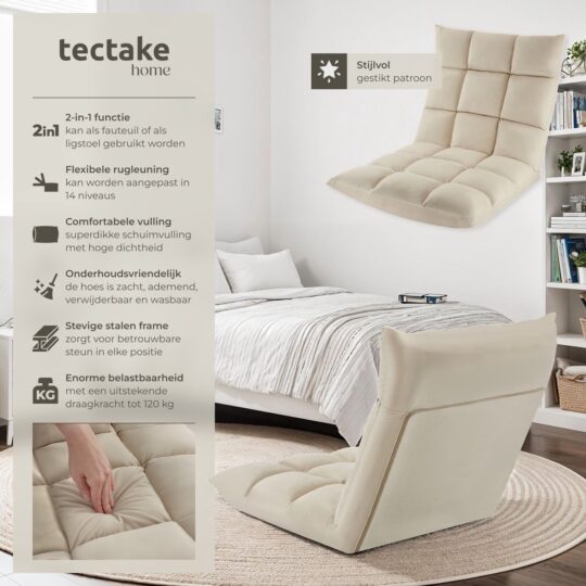 Ben je op zoek naar de ultieme plek om te ontspannen na een lange dag? De tectake Relaxstoel in beige is precies wat je nodig hebt. Deze XXL vloerstoel is niet alleen superhandig, maar ook multifunctioneel. Of je nu wilt zitten, liggen of mediteren, met de verstelbare rugleuning pas je ‘m in een handomdraai aan naar jouw favoriete houding.