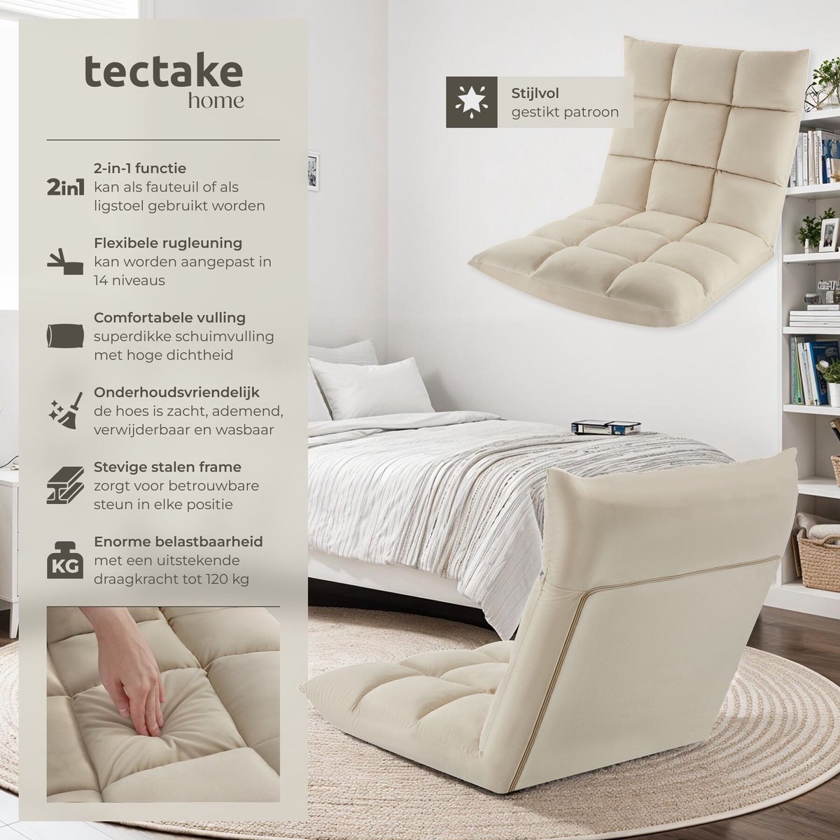 Het slimme opvouwbare design maakt deze relaxfauteuil ideaal voor kleinere ruimtes. Geen gedoe met lompe meubels, want je klapt ‘m zo weg als je ‘m niet gebruikt. Gebruikers zijn dol op het comfort en de veelzijdigheid: de stoel voelt als een zacht vloerkussen, maar biedt ook de stevigheid van een echte fauteuil.