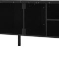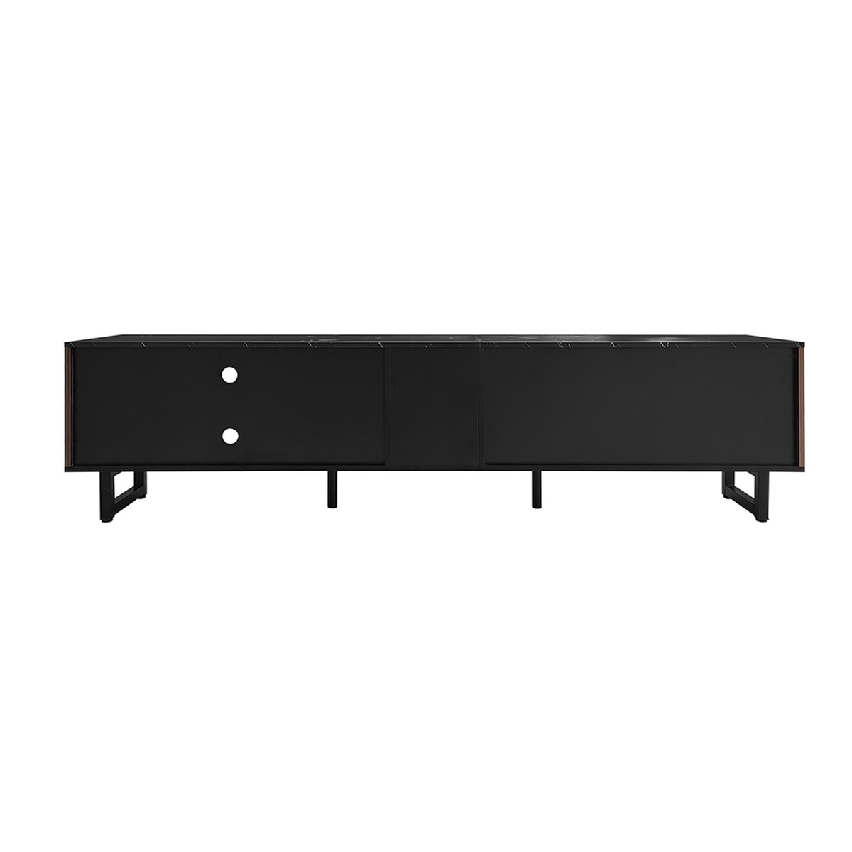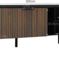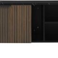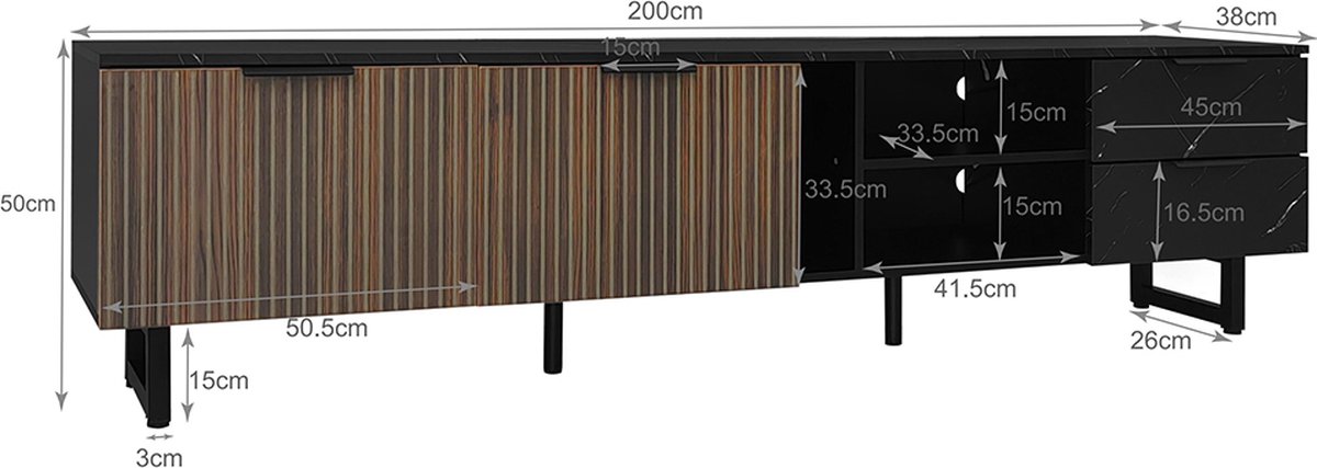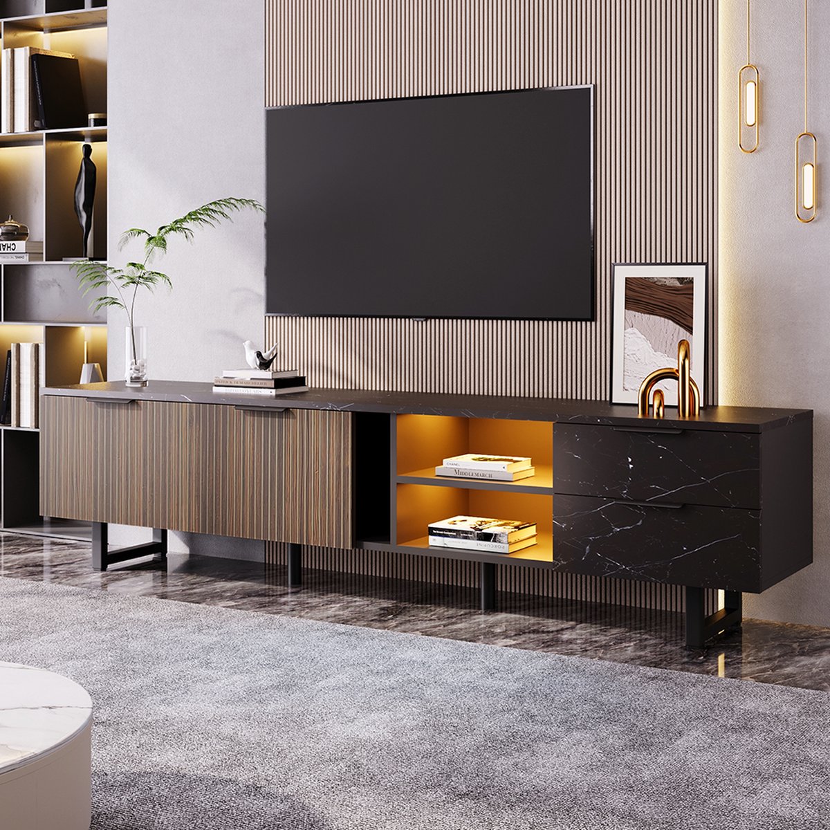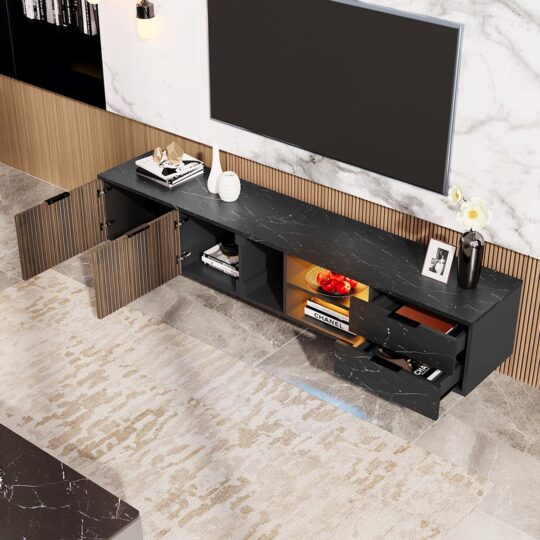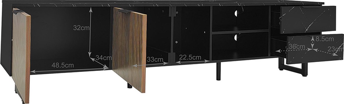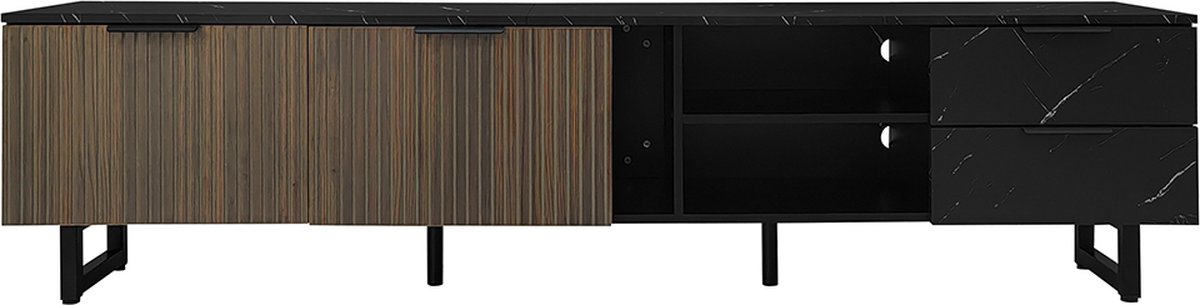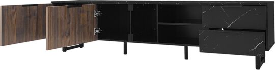Ben je op zoek naar een TV meubel dat niet alleen je televisie draagt, maar ook je woonkamer een flinke stijlboost geeft? Dan is deze zwarte kast met marmeren accenten en donkerhouten deuren een absolute aanrader. Het strakke design combineert luxe met functionaliteit, terwijl de verstelbare LED-verlichting zorgt voor een gezellige sfeer. Perfect voor een moderne inrichting!