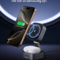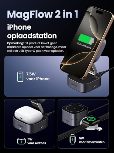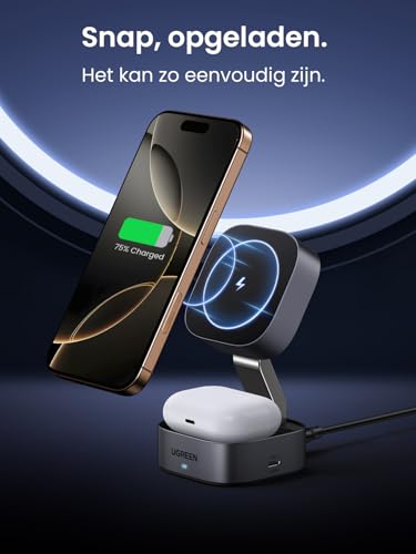 Ben je het zat om met een wirwar van kabels te worstelen? De UGREEN MagFlow 2-in-1 oplaadstation is jouw nieuwe beste vriend. Dit slimme apparaat laadt je iPhone (compatibel met 16, 15, 14, 13 en Pro-modellen) en AirPods tegelijk op, zonder gedoe. Dankzij de MagSafe-technologie klikt je telefoon moeiteloos vast en blijft hij stevig zitten, terwijl de verstelbare hoek zorgt voor het perfecte zicht tijdens het opladen.