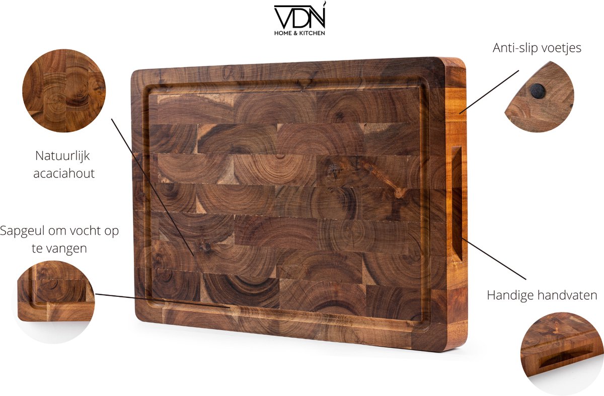 Ontdek de VDN Snijplank van acacia hout met sapgeul en handvaten. Anti-slip, stijlvol en perfect voor elke keuken. Bestel nu bij Trending.nl!