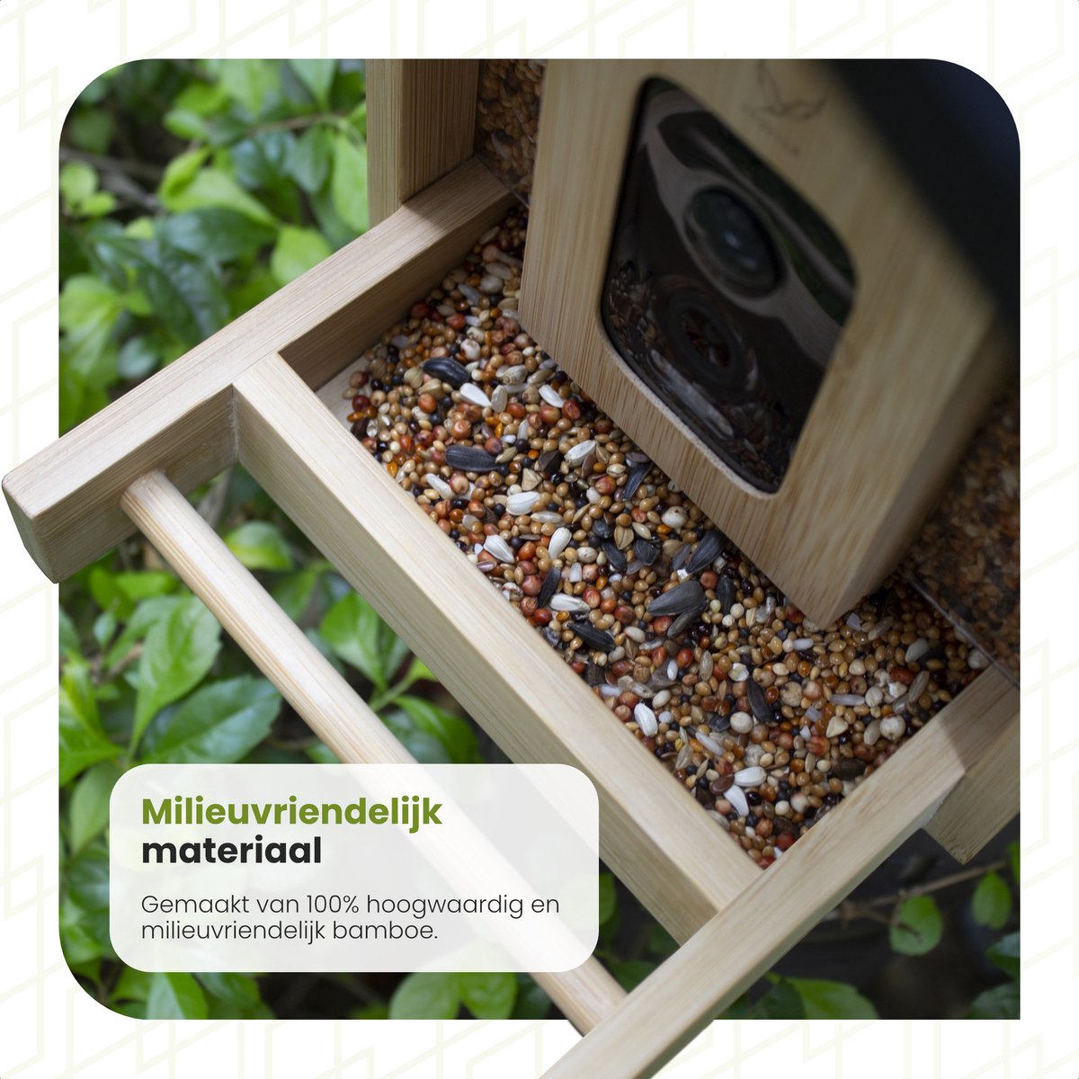Ben je dol op vogels spotten, maar wil je niet uren in de kou staan? Dit Voqella® vogelvoederhuisje met camera is dé oplossing. Hang dit slimme huisje in je tuin, sluit de app aan en bekijk live hoe koolmezen en musjes komen snacken. Dankzij het zonnepaneel blijft de batterij gewoon draaien, zelfs op bewolkte dagen. En dat alles in een stijlvol bamboe design dat perfect in je tuin past.