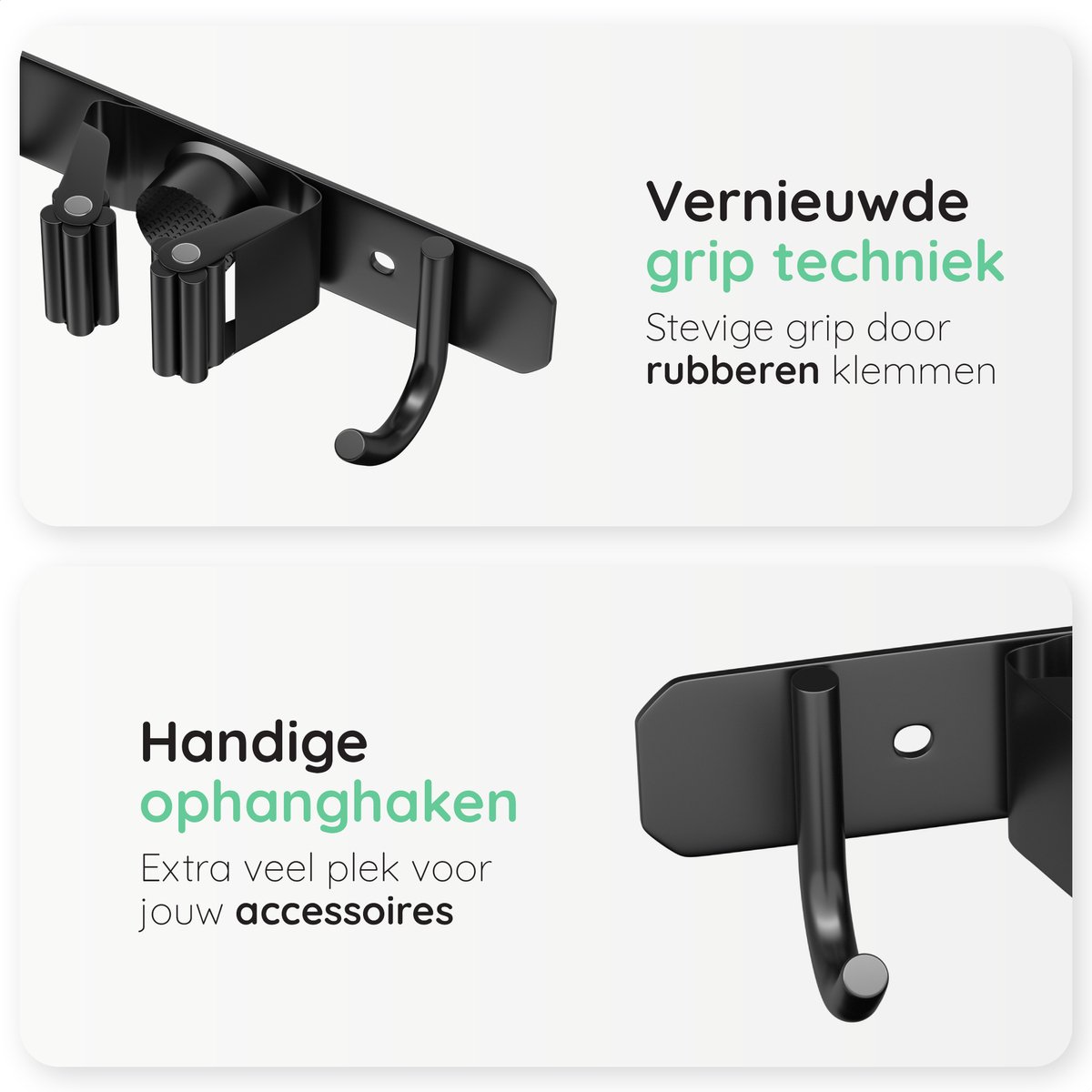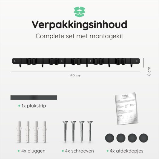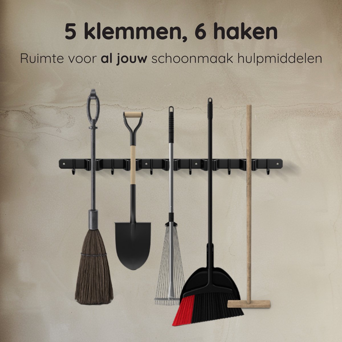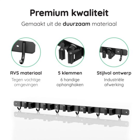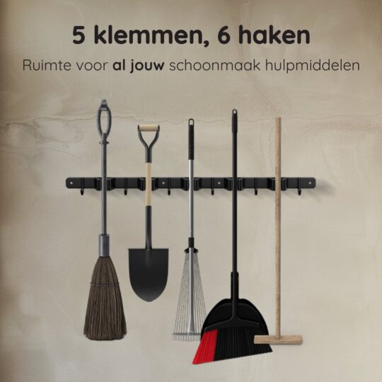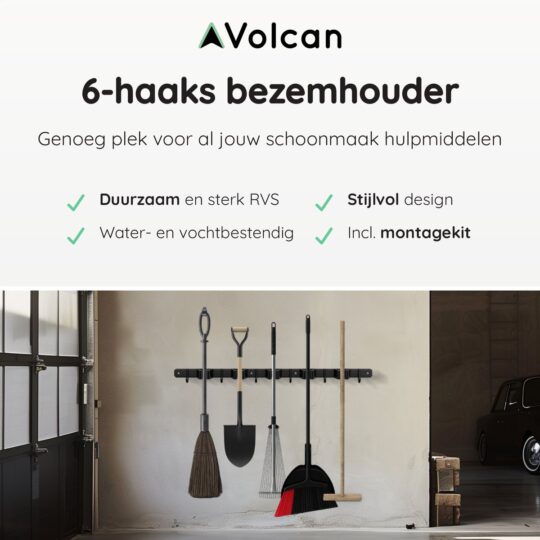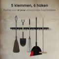 Heb je ook altijd rondslingerende bezems en tuingereedschap in je schuur of garage? Met de Volcan Bezemhouder is dat verleden tijd. Dit slimme ophangsysteem zorgt ervoor dat je alles netjes en binnen handbereik opbergt. Met plek voor 5 gereedschappen en 6 extra haken hang je moeiteloos je schoppen, harken en zelfs kleinere spullen op. Gemaakt van stevig RVS in een strakke zwarte afwerking, past deze houder in elke ruimte.