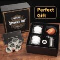 Deze kit bevat alles wat je nodig hebt voor een perfecte rookervaring: een high-end eikenhouten rookblad, een butaanvrije brander, 6 verschillende natuurlijke houtsnippers, 2 stijlvolle whiskyglazen, 2 ijsbalmallen, een metalen filter en een prachtige geschenkdoos.