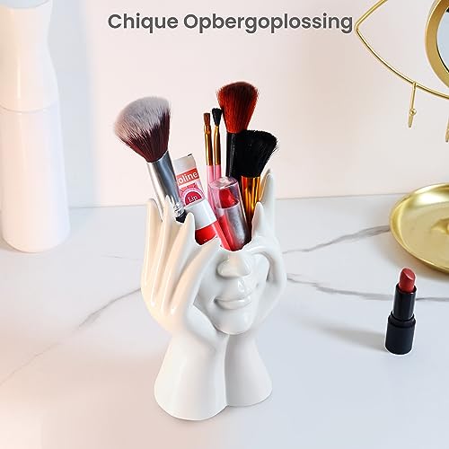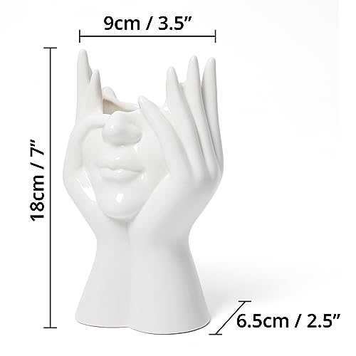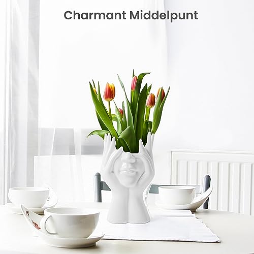 Op zoek naar een eyecatcher voor je woonkamer of slaapkamer? Deze witte keramische vaas met een subtiel gezichtsdesign steelt de show in elk interieur. Met een hoogte van 18 cm en een breedte van 9 cm past hij perfect op een plank, tafel of vensterbank. Of je nu verse bloemen, faux pampasgras of een klein boeket erin zet, deze decoratieve vaas geeft je huis direct een moderne en artistieke touch.