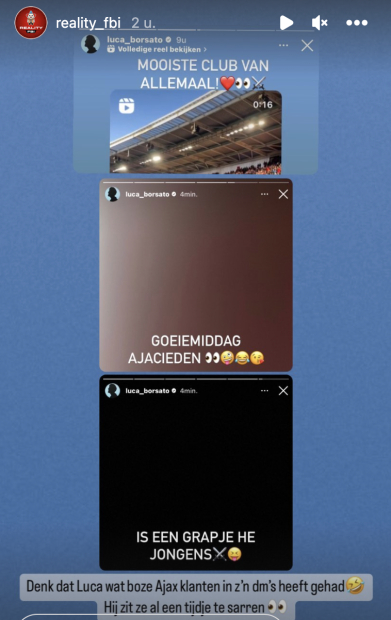 Luca Borsato is net zoals vader Marco een fanatiek supporter van AZ Alkmaar. Het was afgelopen zondag een prachtige dag voor Borsato want ‘zijn club’ wist met 2-1 te winnen van de Amsterdamse club. Hij stak zijn blijdschap niet onder stoelen of banken en besloot zijn vreugdegevoel op zijn Instagram stories te delen. De vreugdekreten van Borsato werden hem niet in dank afgenomen door de F-side van Ajax.