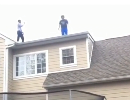 In tekenfilms gaat het allemaal heel soepel. Daar springen ze vanaf grote hoogte op een trampoline, veren terug tot in de wolken en landen daarna op hun voetjes alsof er niets is gebeurt. Waarschijnlijk geïnspireerd door deze cartoons kwamen deze twee jongens op het geniale idee om dit na te doen in de achtertuin. Eerst een glas melk om moed in te drinken, dan het dak op en springen maar! Don't try this at home 😉