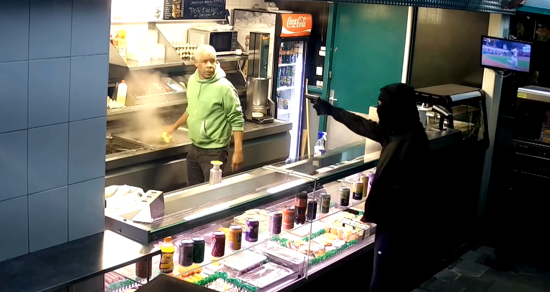 Overal op het internet zijn filmpjes te vinden van het heldhaftige optreden van de 63-jarige man. Echter is de overvaller op dit moment nog altijd op vrije voeten.