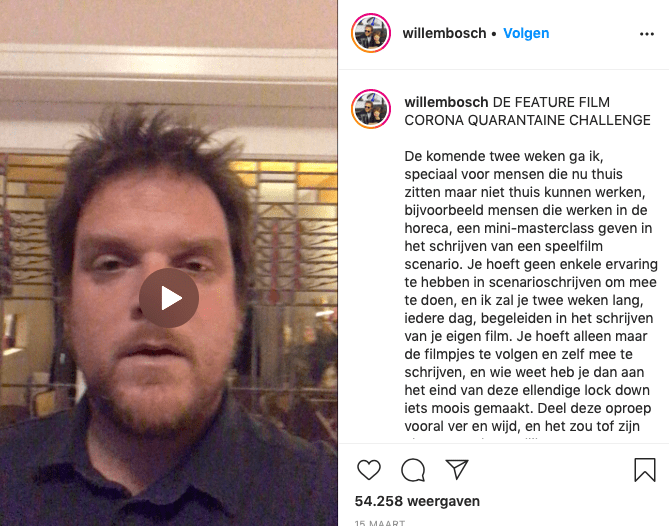 Het is niet persé een cursus, maar leuk is het wel. Via de Instagram van Willem Bosch kun je gratis lessen krijgen op het gebied van scenario schrijven. Willem Bosch is een scenarist van films als Feuten & Baantjer. Via zijn account kun je maar liefst 14 dagen elke dag wat bijleren. Zijn Instagram kun je
